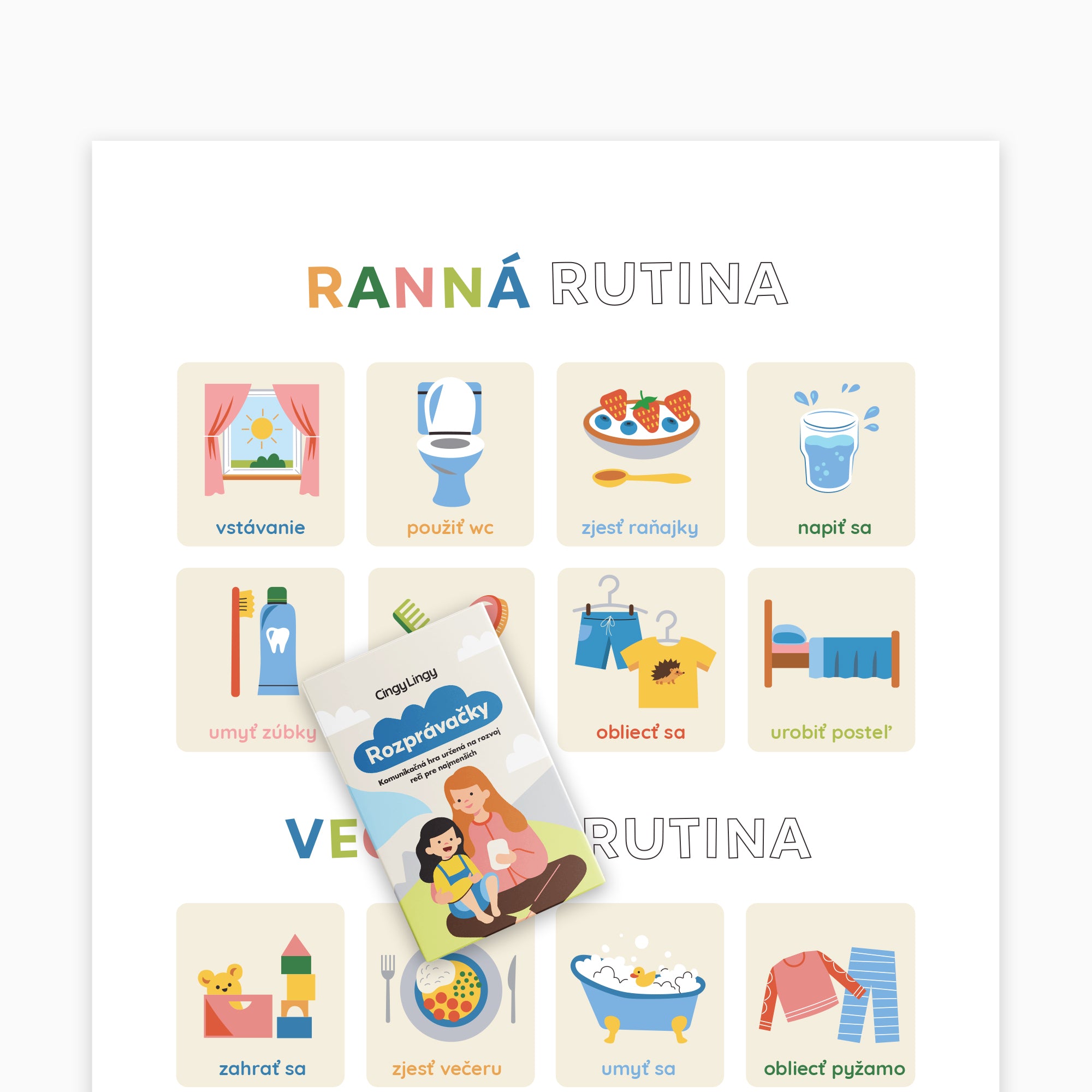 Balíček Rozprávačky a Plagát Rutiny spája všetko, čo dieťa potrebuje na rozvoj svojej reči aj podporu každodenných detských návykov. Kartičky pomáhajú deťom krok za krokom rozvíjať slovnú zásobu a schopnosť vyjadrovať sa vo vetách pomocou hravých otázok a ilustrácií, zatiaľ čo plagát slúži ako milá vizuálna pripomienka bežných denných aktivít, ako je vstávanie, čistenie zúbkov či prezliekanie. Spolu vytvárajú zmysluplnú, hravú a motivujúcu kombináciu, ktorá podporí rečový vývin aj samostatnosť – navyše za výhodnejšiu cenu, ako keby ste si produkty kupovali samostatne.
